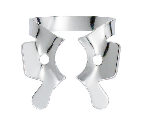 Placera kofferdam, klammer ram samtidigt. Kofferdammen sträcks under klammerns vingar.