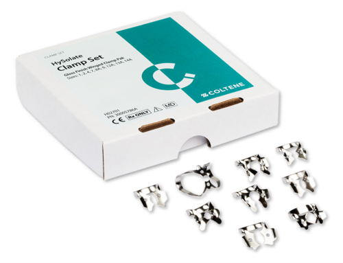 Placera först klammern intraoralt och sträck sedan kofferdammen över klammer och tand. Markderade med ett "W" för Wingless.