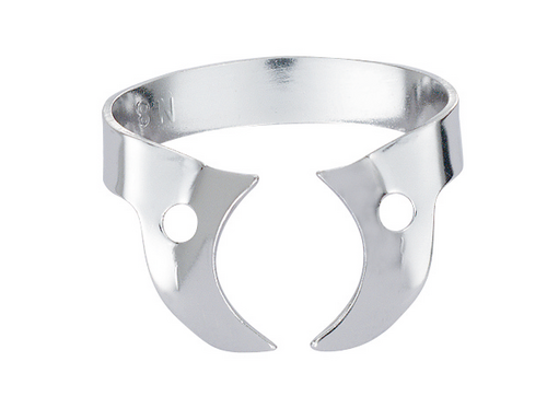 Placera först klammern intraoralt och sträck sedan kofferdammen över klammer och tand. Markderade med ett "W" för Wingless.