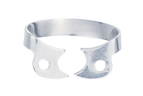 Placera först klammern intraoralt och sträck sedan kofferdammen över klammer och tand. Markderade med ett "W" för Wingless.