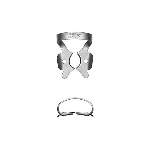 Kofferdamklammer för premolarer, i rostfritt stål, med sidenmatt yta, för att ej reflektera ljus.
