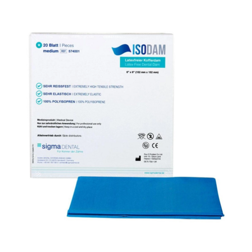 ISODAM levereras i 6” x 6” ark, i både medium och heavy tjocklek. Den är lämplig för alla operativa dentalbehandlingar.