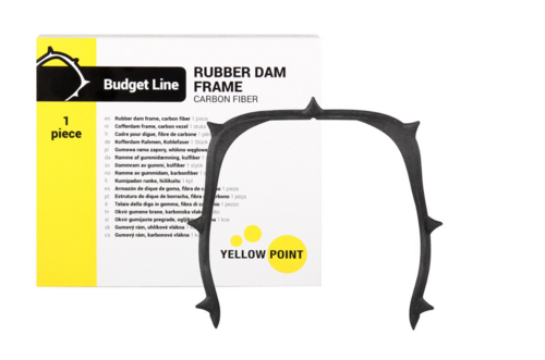 Rubber Dam, svart kofferdamram tillverkad av kolfiber. Den unika formen minskar spänningen i duken och förbättrar hanteringen tack vare bättre grepp. Ramen är tillverkad av autoklaverbar plast och är både hållbar och effektiv.