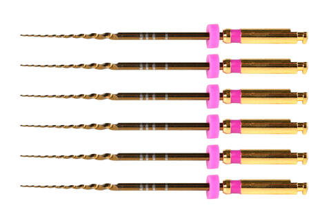Guldfärgade maskinell roterande rotkanalsfil av värmebehandlad nickeltitan.