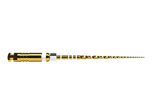Steril guldfärgad roterande maskinell rotkanalsfil av värmebehandlad nickeltitan.