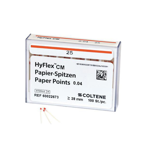 HyFlex CM absorberande pappersspetsar används för att torka rotkanaler som har förberetts med HyFlex CM-filar. Färgkodade för enkel identifiering. Längd: 28 mm. 100st/förp.