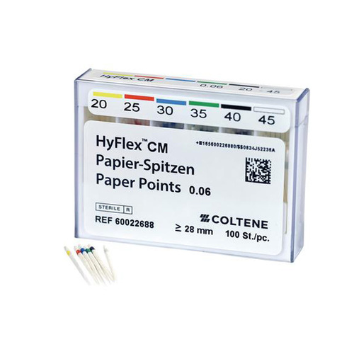 HyFlex CM absorberande pappersspetsar används för att torka rotkanaler som har förberetts med HyFlex CM-filar. Färgkodade för enkel identifiering. Längd: 28 mm. 100st/förp.