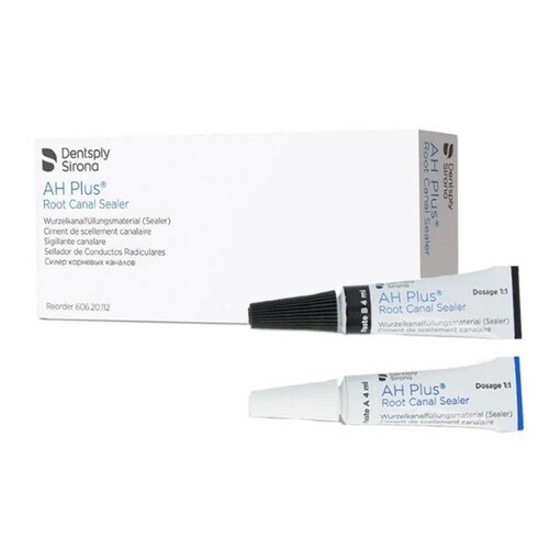 AH Plus är en epoxyaminresin tvåkomponents rotkanalsealer med självadhererande egenskaper och mycket hög radiopacitet. Bas och katalysator i pastaform. Används vid permanent rotfyllning tillsammans med points