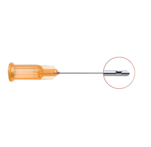 Steril spolkanyl med sluten rundad ände och med spolning i sidan, luer-lock. För periodontal och endodontisk spolning. Storlek: 25G 0,51 x 25 mm. Färgkod: Orange.