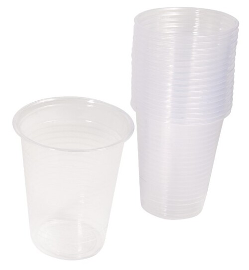 Engångsbägare av biologiskt nedbrytbar komposterbar PLA plast, 180 ml. Höjd 8 cm, diameter 7 cm.