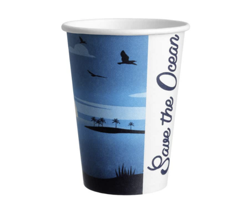 Pappersbägare med motiv save the ocean. Färg: blå/vit.