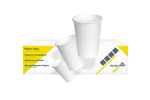 Yellow Point pappersbägare för engångsbruk är tillverkade av återvunnet papper och 100 % återvinningsbara. Storlek: toppdiameter 7 cm, bottendiameter 4,5 cm, höjd 9,3 cm.