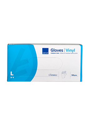 Transparent puderfri undersökningshandske av vinyl med slät yta och rullkant.