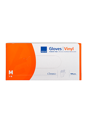 Transparent puderfri undersökningshandske av vinyl med slät yta och rullkant.