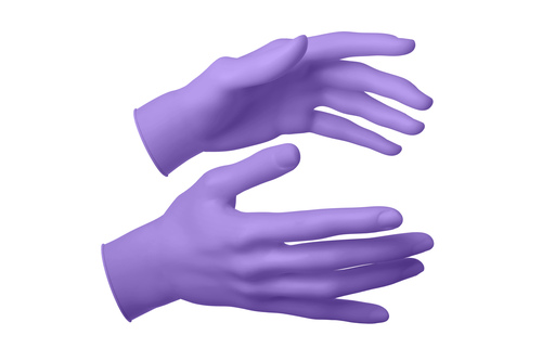Lila puder och latexfria nitrilhandskar.