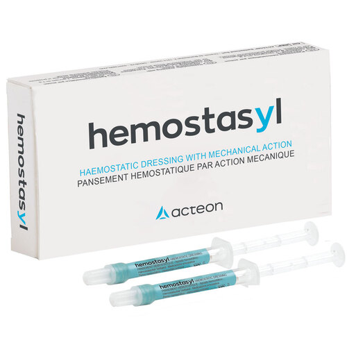 Hemostasyl är en blodstillande gel för applicering på alla moderata blödningar som kan uppkomma inom daglig tandvård. Innehåll: 2 sprutor à 2g