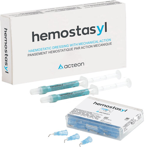 Hemostasyl är en blodstillande gel för applicering på alla moderata blödningar som kan uppkomma inom daglig tandvård. Innehåll: 2 sprutor à 2g och 40st kanyler.