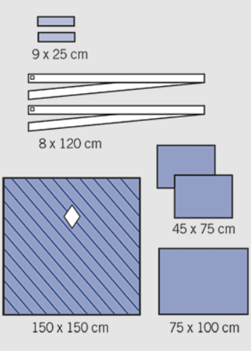 Förpackning: 1 st hålduk 150x150 cm, 2 st operationstejp 9x25 cm, 2 st slanstrumpor 8x120 cm, 2 st operationshanddukar 45x75 cm samt 1 st instrumentbordslakan 75x100 cm
