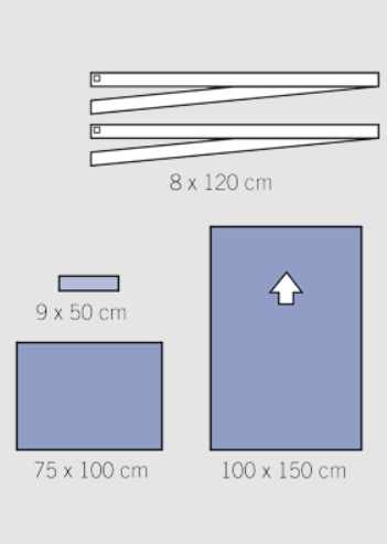 Förpackningens innehåll: 1 st hålduk 100x150 cm, 1 st op.tejp 9x50 cm, 2 st slangstrumpor 8x120 cm samt 1 st instrumentbordslakan 75x100 cm