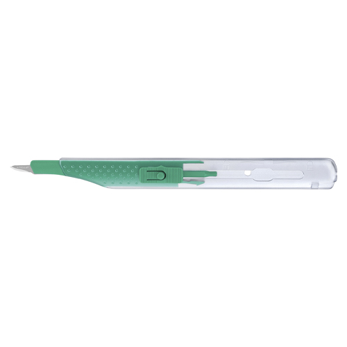 Engångs steril säkerhetsskalpell. Polymerhandtag, förhindrar skärsår och sticksår vid överlämning, övertagande och kassering av skalpeller.