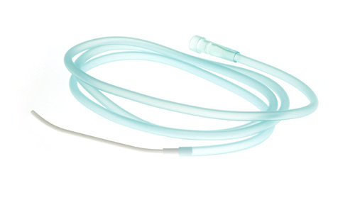 Sterilförpackat sugset för tandkirurgi, av mjuk pvc med dubbelbockat sugmunstycke.