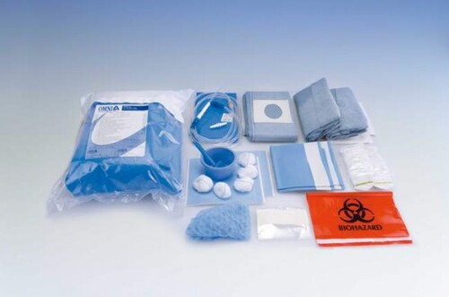 - 2 kirurgiska rockar Expo (storlek L), kirurgiskt vikta, och 2 handdukar i medicinskt papper (Softesse®), ljusblå