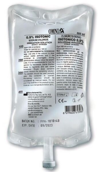Steril koksaltlösning (natriumklorid 0,9%) för kylning av roterande kirurgiska instrument med anslutning för perforator och Luer Lock i 500 ml påsar - ej föremål för medicinska föreskrifter.