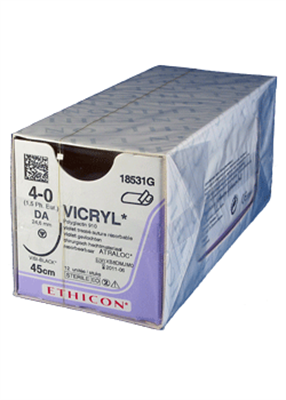 Violett, flätad, syntetisk, vävnadsvänlig och resorberbar sutur. Fullständig resorption 56-70 dagar. Taper Cut rund nål med skärande spets, DA Visi Black nål. Nåldiameter: 0,56mm.