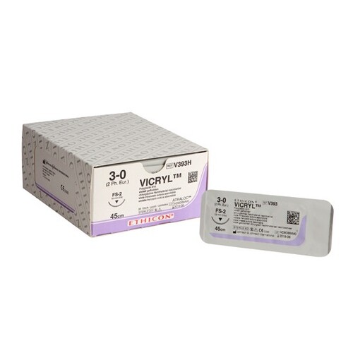 Violett, flätad, syntetisk, vävnadsvänlig och resorberbar sutur. Stark och lätt att knyta. Fullständig resorption 56-70 dagar. FS-2, 3/8 skärande nål. Nåldiameter: 0,55mm