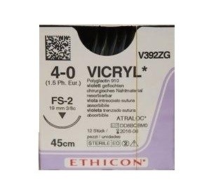 Violett, flätad, syntetisk, vävnadsvänlig och resorberbar sutur. Stark och lätt att knyta. Fullständig resorption 56-70 dagar. FS-2, 3/8 skärande nål. Nåldiameter: 0,55mm