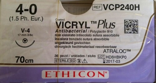Flätad, syntetisk och vävnadsvänlig sutur, antibakteriellt impregnerad med syntetiskt antiseptika.Fullständig resorption 56-70 dagar. V-4, 3/8 Taper Cut. Nåldiameter: 0,43mm.