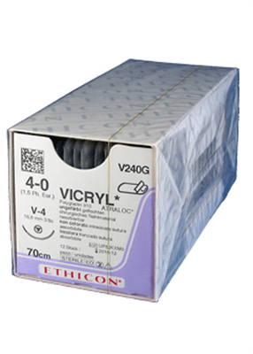 Violett, flätad, syntetisk, vävnadsvänlig och resorberbar sutur. Stark och lätt att knyta. Fullständig resorption 56-70 dagar. 3/9Taper Cut V-4 nål. Nåldiameter: 0,43mm