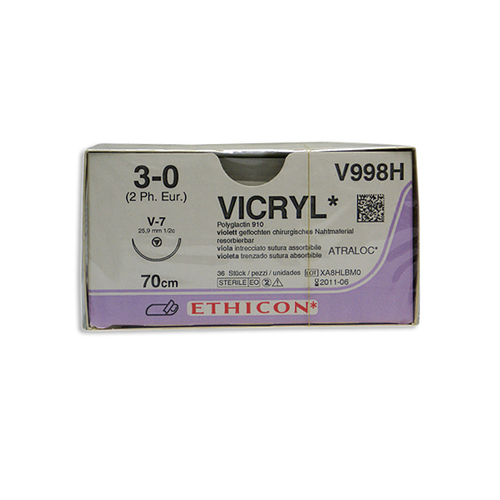 Flätad syntetisk vävnadsvänlig sutur. Resorberbar efter 25-28 dagar och fullständig resorption efter 56-70 dagar. Tråd 3-0, nål V-7, längd 70 cm. Violett (lila).