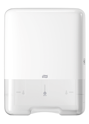 Snygg dispenser i plast för C-vikta handdukar. Enkel och praktisk. Lätt att fylla på. Dispenserhuven öppnas i sidled.