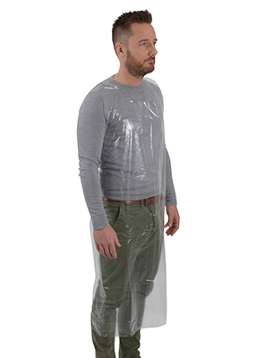 Transparent skyddsförkläde av plast med präglad yta, för engångsbruk. Storlek: Bredd 81 x längd 125 cm. Indviduellt vikta i praktisk ask.
