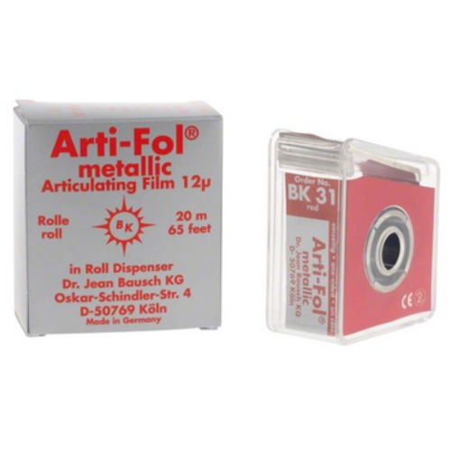 Röd metallic 22 mm bred enkelsidig ocklusionsfolie 8 my, längd 20 m. Dispenser med varje rulle.