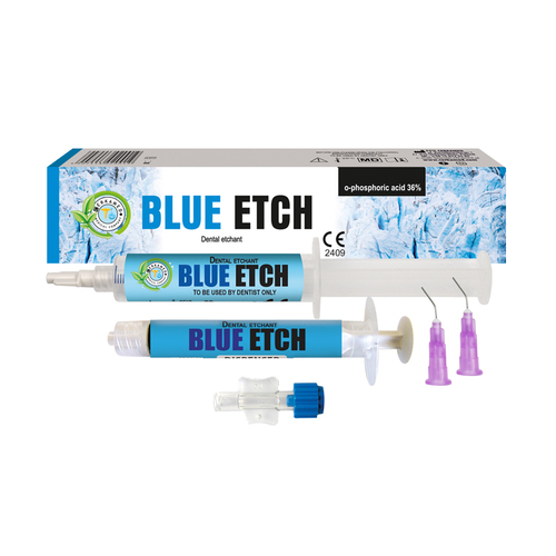 BLUE ETCH är en högkvalitativ etsgel baserat på 36 % ortofosforsyra. Gelen har perfekt konsistens och tixotropa egenskaper, vilket gör att den blir flytande vid applicering men stelnar direkt på ytan – den rinner därmed inte från emaljkanten. Produkten har utmärkt vidhäftning, är lätt att skölja bort och den blå färgen ger hög precision och kontroll vid applicering.