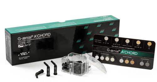 Estetisk ljushärdande universalkomposit med ett förenklat färgsystem i en egen utvecklad filler- och silan teknologi, mjuk och formbar. Består av 5 st grundfärger som uppnår estetiken i 16 klassiska VITA-färger, som täcker hela 90 % av restaurationerna. Genom att använda olika brytningsindex integreras G-aenial A´chord naturligt i tandstrukturen. Har en naturlig fluorescence. Radiopak. A1 (A1, B1, D2), A2 (A2, B2, C1, D3), A3 (A3, B3, C2, C3, D4), A3, 5 (A3,5, B4, C4), A4 (A4). Det finns även några ytterliga färger för fler estetiska möjligheter som emalj-, opaka-, cervikala färger samt 2 bleachfärger.