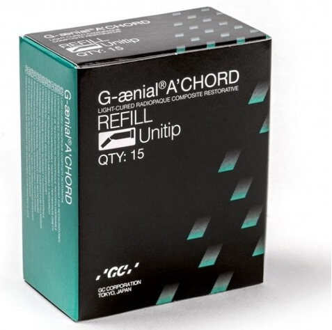 Estetisk ljushärdande universalkomposit med ett förenklat färgsystem i en egen utvecklad filler- och silan teknologi, mjuk och formbar. Består av 5 st grundfärger som uppnår estetiken i 16 klassiska VITA-färger, som täcker hela 90 % av restaurationerna. Genom att använda olika brytningsindex integreras G-aenial A'chord naturligt i tandstrukturen. Har en naturlig fluorescence.