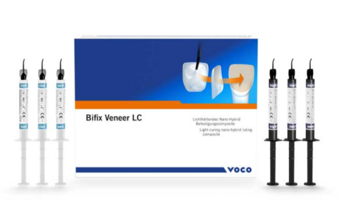 Förpackning: Bifix Veneer LC spruta 3 × 2 g (ljus, klar, varm), Bifix Veneer Try-In spruta 3 × 2,5 g (ljus, klar, varm), Vococid spruta 2 ml, Ceramic Bond SingleDose 20 st, Futurabond U SingleDose 20 st, Sticky Tim 10 st, tillbehör.
