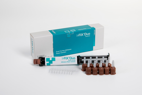 i-FIX Duo Cement är ett självbondande; dualhärdande resincement i automixspruta - Lämplig för permanent cementering av indirekta restaureringar, inlays, onlays, kronor, broar och stift.