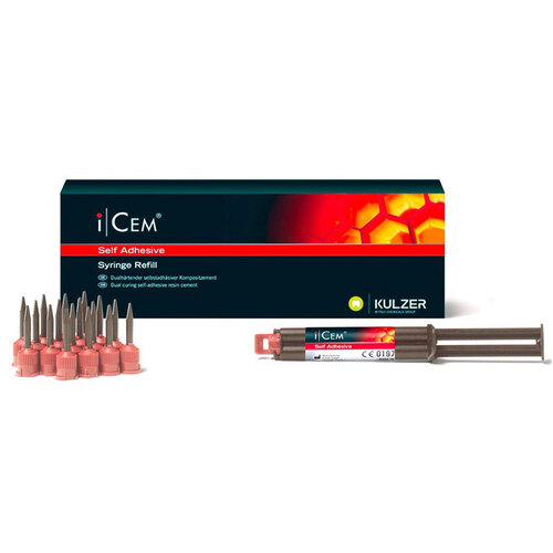 iCEM Self Adhesive är ett dualhärdande, självetsande komposit- cement. Ets, prime och bonding är ej nödvändig.Indikationer: Cementering av kronor, broar, inlays, onlays, och stift.1 automix spruta 5 ml, 15 blandningstippar, piktogram ochbruksanvisning