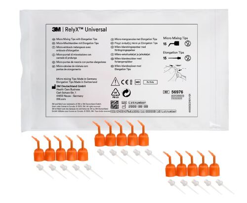 Oranga mikro blandningsspetsar och vita förlängningsspetsar för direkt applicering av RelyX Universal Resin Cement i automixspruta. Den unika blandningsspetsens miniatyr design ger mindre spill jämfört med andra automixsytem. Elongeringsspetsen fäst på blandningsspetsen för enkel applicering av cement i rotkanalen.