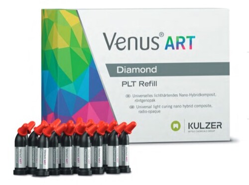 Universal röntgenkontrasterande nanohybridkomposit för restaurationer i Klass I-V kaviteter. Baserad på ny monomer vilken ger materialet en låg krympning. Finns i 27 färger. Venus Diamond PLT A22x10x0,25 g