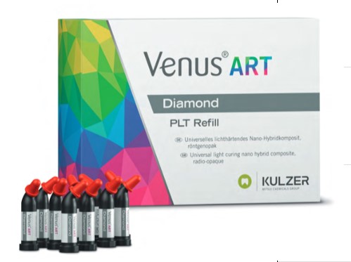 Universal röntgenkontrasterande nanohybridkomposit för restaurationer i Klass I-V kaviteter. Baserad på ny monomer vilken ger materialet en låg krympning. Finns i 27 färger. Venus Diamond PLT B31x10x0,25 g