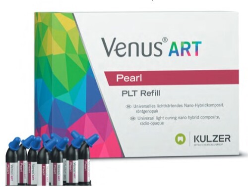 Universal röntgenkontrasterande nanohybridkomposit för restaurationer i Klass I-V kaviteter. Baserad på ny monomer vilken ger materialet en låg krympning. Finns i 27 färger och tre translucenser. Venus Pearl PLT BXL 1x10x0,2 g