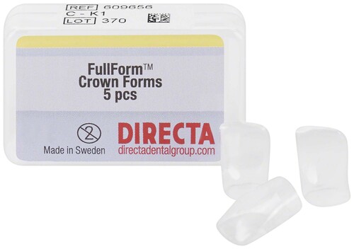 Transparenta kronformar av stark, laminerad plast. Finns med F-, OP- och C-kodning.
