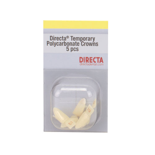 Temporära tandfärgade opaka polykarbonatkronor för 3:or höger i ök - 13. Längd 13,0 mm, bredd 9,0 mm.