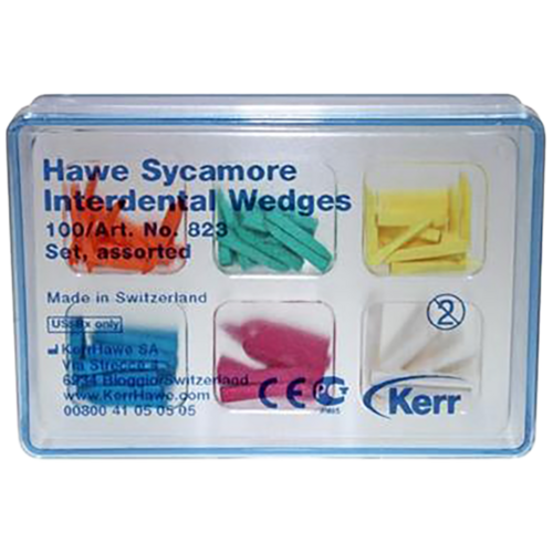 Färgkodade anatomiskt utformade interdentalkilar av sycamore trä. De konkava sidorna anpassar sig till den interdentala konturen. Den kvadratiska änden möjliggör enkel isättning av kilen och den uppåtvända spetsen förhindrar skador på papillerna. Sorterade färger i 6 storlekar