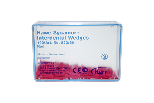 Färgkodade anatomiskt utformade interdentalkilar av sycamore trä. De konkava sidorna anpassar sig till den interdentala konturen. Den kvadratiska änden möjliggör enkel isättning av kilen och den uppåtvända spetsen förhindrar skador på papillerna. Röd, 16 mm.